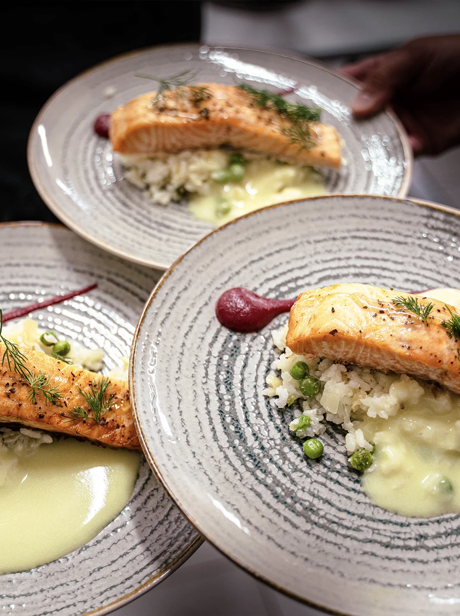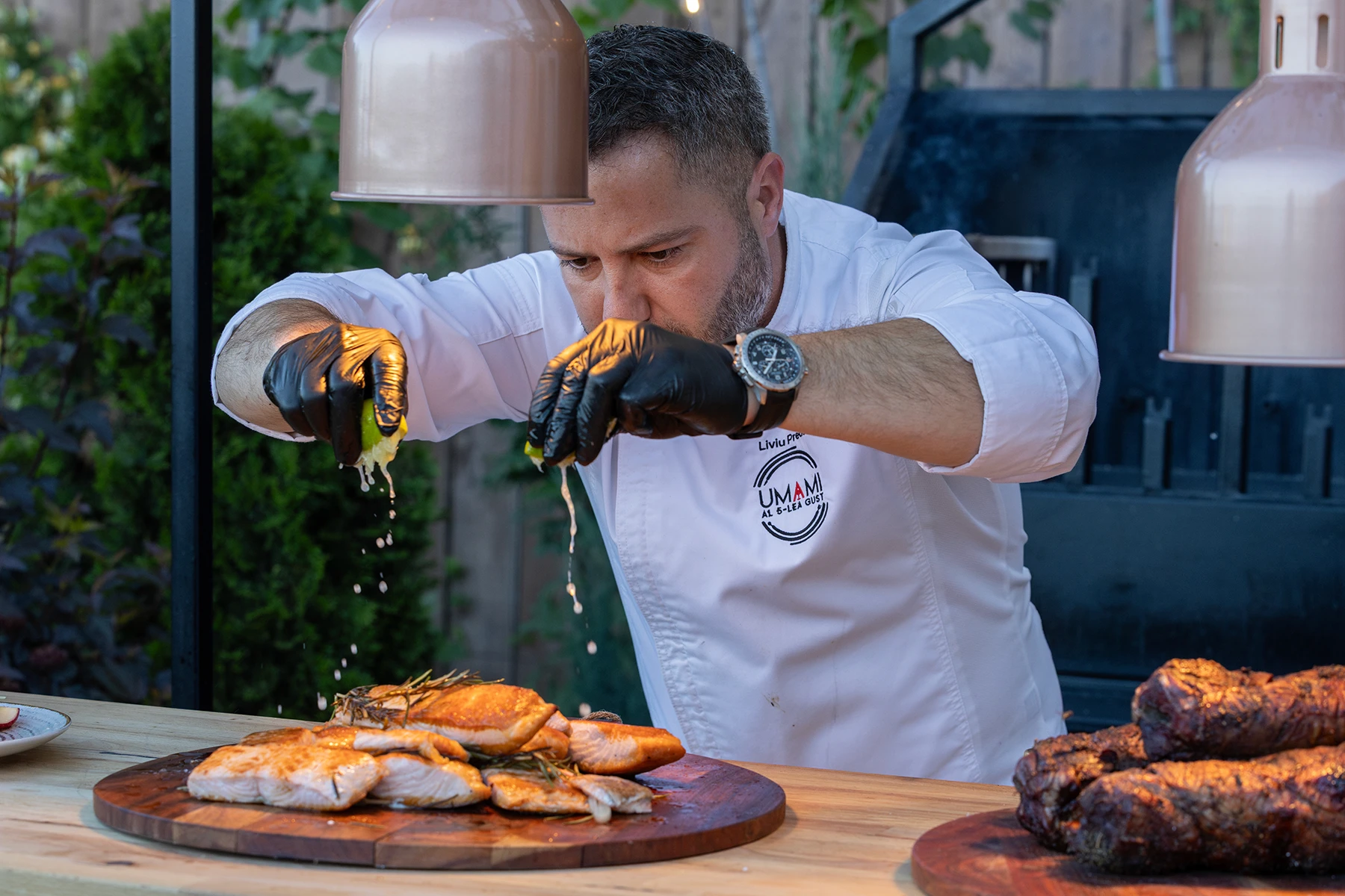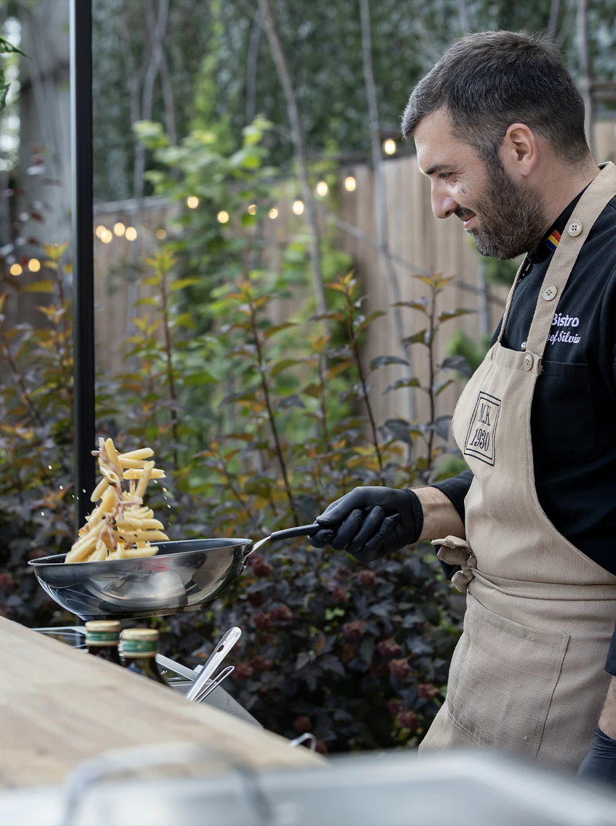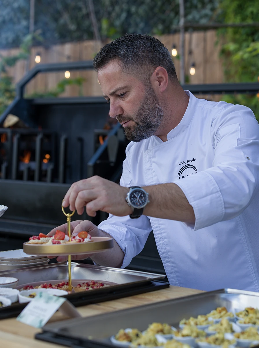 Pentru toate evenimentele organizate în locația noastră, am pregătit un concept special pentru meniuri: live cooking. Acest lucru înseamnă că toate preparatele sunt gătite pe loc, chiar în fața invitaților. Chef Liviu Preda, bucătarul nostru, aduce în fața publicului un show gastronomic dinamic, spectaculos, dar și foarte delicios. Invitații pot urmări cum se pregătește fiecare fel de mâncare, pot interacționa cu bucătarul și pot să-și adapteze preparatele exact pe gustul lor.